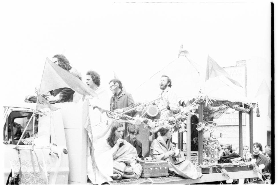 Here is Hayagriva, and Devananda, who later became Devananda Svami.  There’s a “scalphorn? Prabhuapda said at this time, “Hippies are our best customers.” In 1969 he gave this.  And here is a wonderful picture of the “flower power people” following our wonderful Rath cart. So there is the picture that Prabhupada did, the dome.  These are so classic, vintage San Franscisco, pictures of the hippies enjoying Lord Jagannath. Okay.