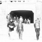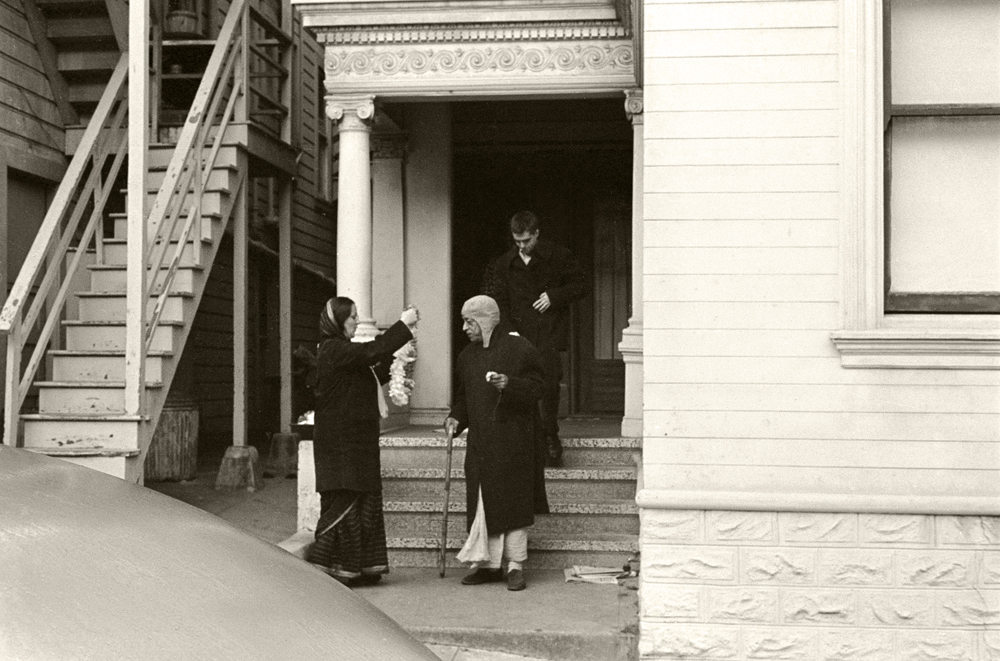 SF Arrival: At last Srila Prabhupada arrived in San Fransicso, accompanied by his servant, Ranchor. When he arrived at the airport Shyamasundar brought his dog, Ralphie, who travelled in and out of Srila Prabhupada’s feet. Allen Ginsberg was to the side of Prabhupada, Mukunda behind, Yamuna, Harsharani, Janaki, Malati, Lilavati. This was the first time that many devotees had seen Srila Prabhupada, for the first time. You can see everyone dressed very nicely for the event. Most of the beads and the flowers of the hippie-dom weren’t there. There is Rayarama had come from the East coast. There was a small but motly crew of people who came. There’s Janaki by Srila Prabhupada at the car door, wearing a little red dress, and presenting Srila Prabhupada with flowers. So many flowers, nice. That was such a wonderful day. That was the first day Gurudas, he had on a nice pair of kaki trousers and a T-shirt for that event. He was right behind Prabhupada, standing on.